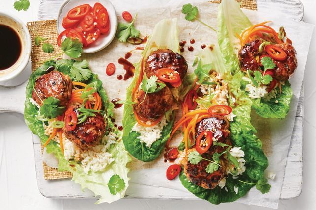 Sticky san choy bao pork rissoles.